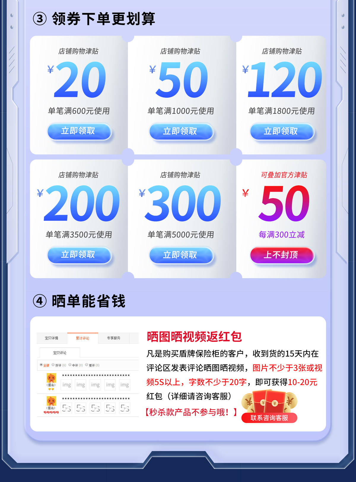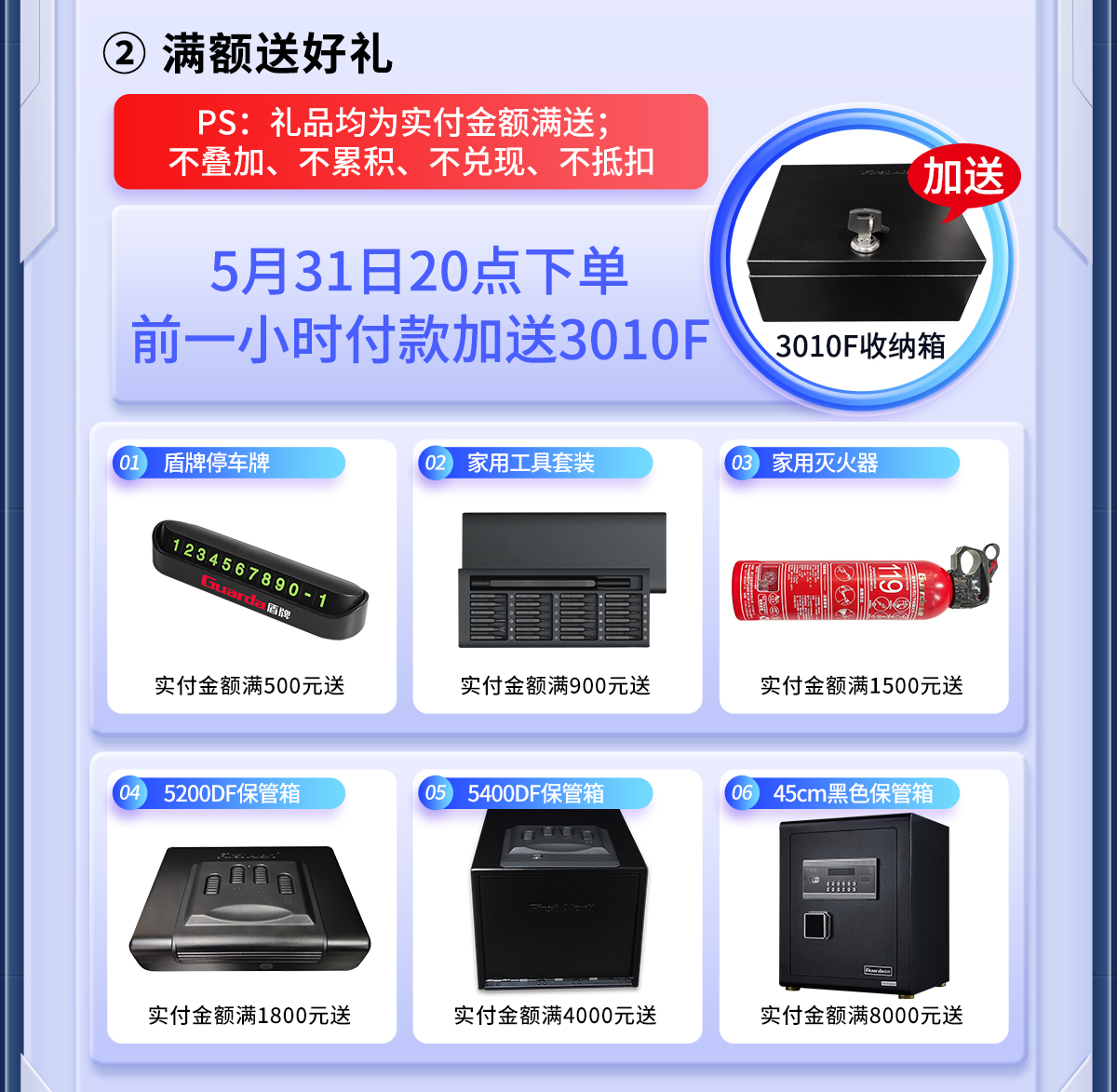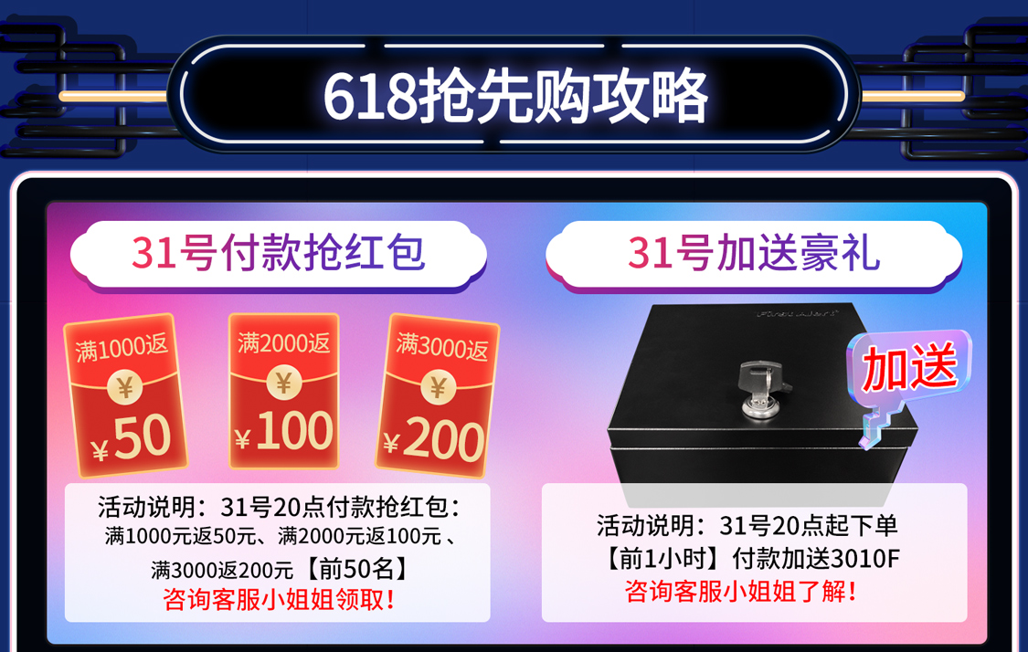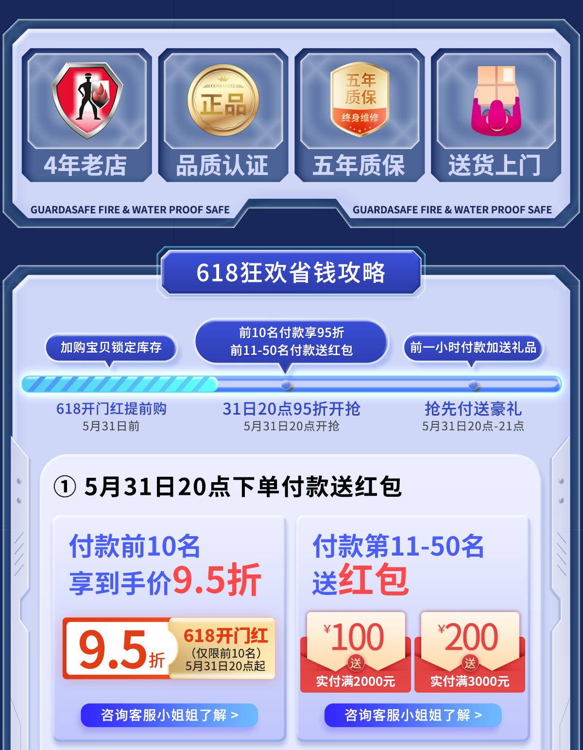 在眾所期盼中,6月份終于要來到,“618”也正式進(jìn)入倒計時?!岸缡贮h”早已按捺不住激動的心情。5月31日20點,一年一度的618開門紅盛典全面開啟,每299減50(5月31日晚20點~6月3日24點)。今年618可以算得上是歷屆以來最值得關(guān)注的一個618大促,因為今年的玩法相對以往有了較大變化,本次大促的優(yōu)惠、福利都是前所未有的。在一片火熱的氛圍中,盾牌保險箱也不例外,也加入了這場大戰(zhàn)中。 畢竟,6月份的到來,伴隨著的是火熱的夏天也到了,而夏天正是用電高峰期,也是火災(zāi)頻發(fā)的一個季節(jié)。因此,如何保證家庭財產(chǎn)的安全成為不少人關(guān)心的問題,特別對于那些家里的貴重物品比較多,但是經(jīng)常需要出差,或者是朝九晚六的上班族來說,長的時間不在家,比較擔(dān)心家里的財產(chǎn)是否安全,這時候擁有一臺防火保險箱(柜)就顯得尤為重要,更能保障財產(chǎn)的安全。如果說家里的大門一道安全防線,那么防火保險箱(柜)就是第二道。名貴手表、首飾以及房產(chǎn)證等重要物件的存放,辦公室重要資料、合同的儲存,都需要一臺防火技術(shù)過硬的防火保險柜。正好,可以趁著這次的活動,給貴重物品一個保障。 接下來就帶領(lǐng)大家一起來看看盾牌保險箱在不同電商平臺的優(yōu)惠活動,讓你多一種選擇。 1.京東旗艦店【盾牌保險柜官方旗艦店】 (1)31號20點付款搶紅包,滿1000元返50元、滿2000元返100元 、滿3000返200元(前50名) (2)31號20點起下單前1小時付款加送3010F (3)全場限時一件9.5折(5月31日晚20:00~6月1日02:00) 2.京東專賣店【盾牌保險柜專營店】 (1)領(lǐng)豪劵(平臺滿減+店鋪劵疊加) (2)前50名付款滿額返紅包 (3)5月31日21:00前付款加送豪禮 (4)下單即享好禮 3.天貓旗艦店【盾牌辦公旗艦店】 (1)領(lǐng)劵下單 疊加滿減更劃算 (2)前50名付款滿額返紅包 (3)限時付款加送豪禮 (4)收藏加購下單 滿額送好禮 4.天貓專賣店【盾牌豐爾登專賣店】 (1)5月31日20:00下單付款送紅包 (2)滿額送豪禮(5月31日20點下單前一個小時付款加送3010F) (3)領(lǐng)劵下單更劃算 真香 更何況618開門紅的活動這么優(yōu)惠 此時不買更待何時? 難道等到它漲價再買么?