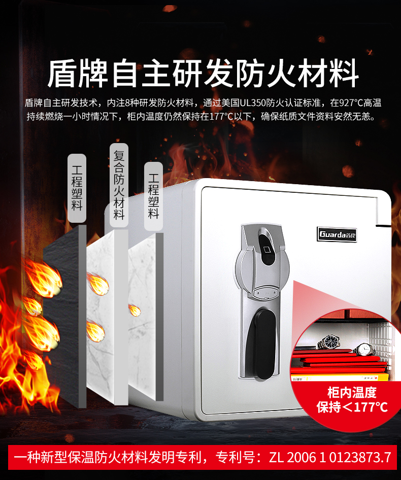 保險(xiǎn)柜,一個曾經(jīng)被人們忽視的物品,隨著社會的不斷進(jìn)步,人民生活水平的不斷提高,對安全管理與理財(cái)也產(chǎn)生新的認(rèn)識。如今的保險(xiǎn)柜不僅僅是局限于企業(yè)辦公、銀行金融、機(jī)關(guān)單位等特殊領(lǐng)域,已經(jīng)邁向于家庭使用了。 保險(xiǎn)柜是保存重要物品和保密文件的有可靠的保險(xiǎn)裝置的柜子,可以防盜、防火、防水、防磁等。 有人說,我家沒什么值錢的物品,錢都存在銀行??墒悄阋?,并不是只有現(xiàn)金才值錢,結(jié)婚的鉆戒,投資的金條,能夠升值的紀(jì)念幣,不記名國債,甚至是祖?zhèn)鞯囊患骷夜哦苌儆腥巳ャy行開托管服務(wù),先不說這些東西會丟失,因?yàn)閬G失還有可能被找回,如果一旦遭遇火災(zāi),被大火一把給燒毀了,豈不是要窩心? 而作為保險(xiǎn)柜產(chǎn)品的變革者與創(chuàng)新者,盾牌的核心功能——防火技術(shù)。盾牌保險(xiǎn)柜是國內(nèi)一個專業(yè)防火保險(xiǎn)柜品牌,與傳統(tǒng)保險(xiǎn)柜不同,所用材料不是水泥鐵板,而是具有專利的新型復(fù)合防火材料。其門板與箱體間有獨(dú)特密封設(shè)計(jì),遇高溫時(shí)會進(jìn)行安全防火密封,具有很強(qiáng)的防火防水功能。經(jīng)反復(fù)實(shí)驗(yàn)測試,盾牌防火保險(xiǎn)柜可在接近1000攝氏度高溫中燃燒1個小時(shí)的情況下,依然保證柜內(nèi)物品的安全無損;防水技術(shù)更是可以做到將整個保險(xiǎn)柜完全浸入水面下30公分長達(dá)8小時(shí)仍滴水不漏。 查看更多618狂歡日活動可點(diǎn)擊下方鏈接 京東盾牌保險(xiǎn)柜官方旗艦店:https://mall.jd.com/view_page-192098567.html 京東盾牌保險(xiǎn)柜專營店:https://mall.jd.com/index-789685.html 天貓盾牌辦公旗艦店:https://guarda.tmall.com/ 天貓盾牌豐爾登專賣店:https://guardafed.tmall.com/index.htm?spm=a220o.1000855.w5002-23027614119.2.4b6640f4ORHjKp