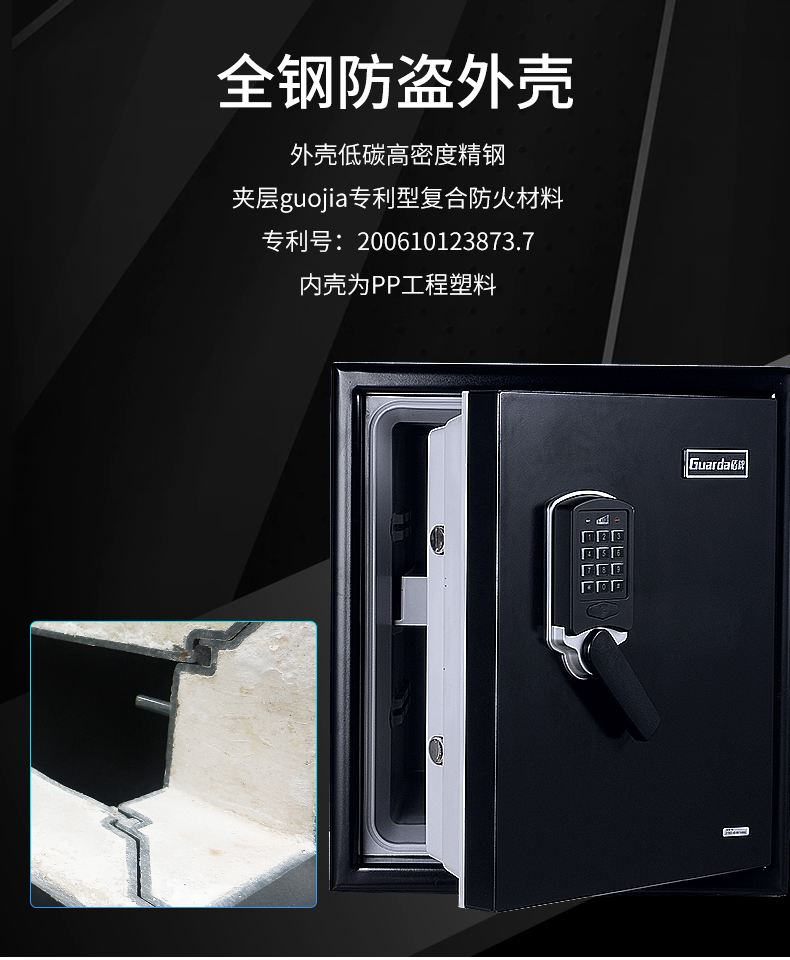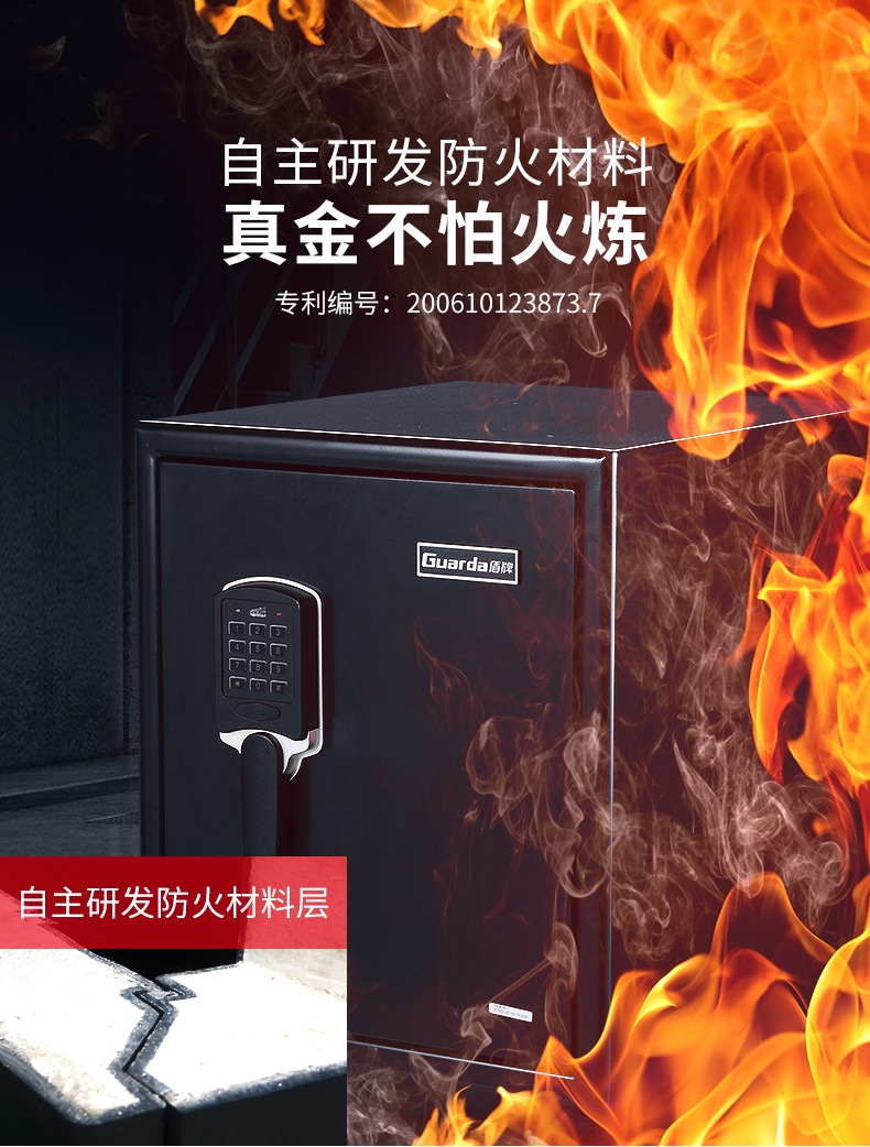 外觀采用全鋼板外殼設(shè)計(jì),給人簡(jiǎn)約干練的主觀感受,同時(shí)耐繡、耐磨,使用壽命長(zhǎng);防水槽采用全密封設(shè)計(jì),暢達(dá)8小時(shí)長(zhǎng)效防水;內(nèi)注自主研發(fā)的復(fù)合防火物料,從室溫開始于120分鐘內(nèi),柜外溫度達(dá)1010℃時(shí),柜內(nèi)溫度仍保持在177℃以下,有效保護(hù)箱內(nèi)的紙質(zhì)及其它有價(jià)值物件;升級(jí)鎖地設(shè)計(jì),可鎖地、入墻、入柜等。
