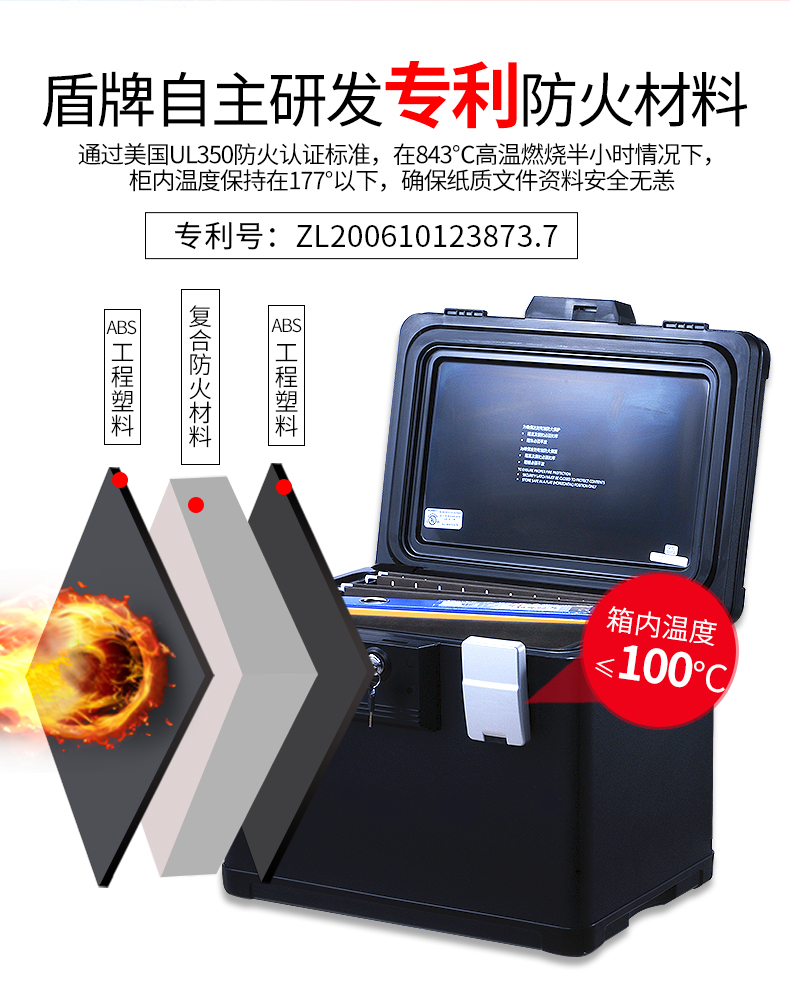 而盾牌防火防水保險柜外觀新潮,款式多樣,美觀實用,產(chǎn)品系列可配合不同用戶的要求,并享有五年售后保用及終生保用信譽保證。產(chǎn)品擁有美國UL125一小時認證,UL350半小時、一小時,二小時的防火測試認證,是目前世界公認的對防火級別高要求的認證。在防火保險柜領域獲得發(fā)明專利2項,包括自有研發(fā)的防火材料以及實用專利7項,外觀專利12項。美國專利局也對盾牌發(fā)出隱藏式防火防盜門軸設計專利認證、防火防水鎖地專利認證。